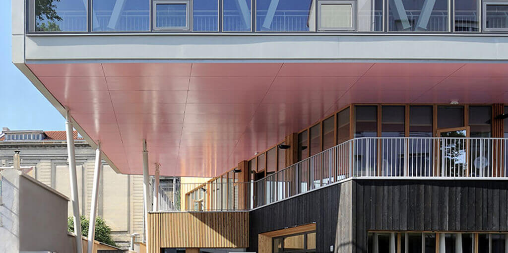 Identificateur du lieu et signal fort de l’équipement public par sa configuration en porte-à-faux, la salle de sport, au R+2, crée l’auvent donnant sur la rue Paul Bert et abritant l’accès principal du groupe scolaire. Sa façade principale Nord en polycarbonate de haute qualité, crée une translucidité de paroi nécessaire pour établir le lien entre l’espace public et l’équipement, démontrant sa vocation d’accueil polyvalent (scolaire et extra-scolaire), permettant son appropriation par les associations sportives de quartier. Les accès au gymnase sont conçus de façon à permettre cette utilisation interne et externe au groupe scolaire, et bénéficient ainsi d’une circulation principale donnant directement sur l’accueil rue Paul Bert et un accès secondaire vers le groupe scolaire Meynis existant. Les voiles constitutifs des volumes dont les façades sont en décalage, en retrait et en encorbellement par rapport au niveau inférieur et les voiles intérieurs situés au droit des grands ensembles fonctionnels (salles de restauration en RDC, zones d’aménagement des salles de références, bureaux et salles plurivalentes en R+1) pour lesquels aucun porteur n’est souhaitable intermédiairement, fonctionnent en poutre-voile et voiles en drapeaux suivant le schéma courant bielles-tirants et s’appuient horizontalement les uns aux autres par l’intermédiaire des différents niveaux de planchers inférieurs et supérieurs formant diaphragmes.