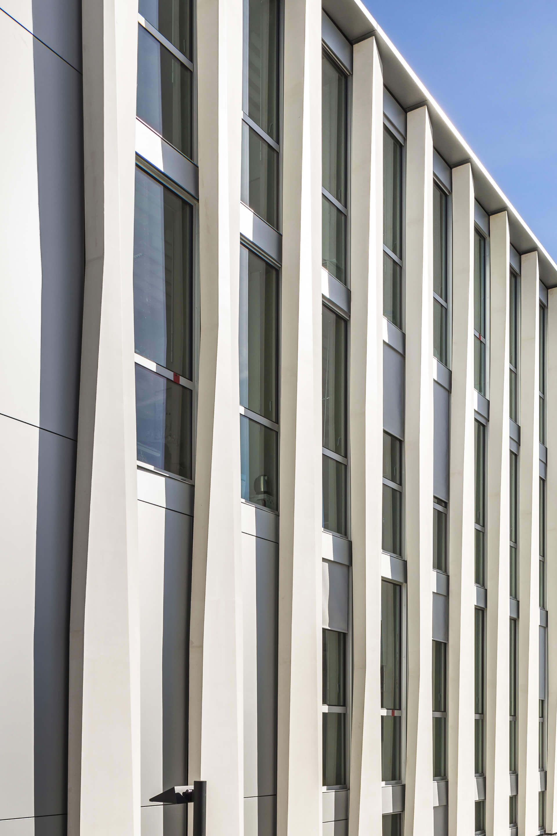Le projet en R+3 sur un niveau de sous sol partiel enchâssé, accueille au rez-de-chaussée les salles d’audience en double hauteur et la salle des pas perdus, centrale et traversante, éclairée par une large verrière. Les porteurs ponctuels béton armé de façade de section 0.20 x 0.30 m et d’entraxe 1.35 m sont associés à une file de porteurs intermédiaires de même section et d’entraxe 2.70 m aux niveaux R+2 et R+3 afin de reprendre les différents niveaux de planchers dalles, activés thermiquement par l’incorporation au coulage d’un réseau de tubes réticulés. Les façades porteuses sont isolées par l’extérieur. Les éléments de façades sont réalisés d’une pièce sur la hauteur du bâtiment et ils ont une largeur variable et alternent avec des parties vitrées réalisées en éléments verriers. Outre les toitures terrasses végétalisées adjacentes à la verrière de la salle des pas perdus, l’ensemble des complexes de couverture est repris par une charpente métallique à base de portiques métalliques mécano-soudés associés à un empennage à base de profilés laminés. La toiture plissée présentant des points hauts et des points bas, autorise de part sa forme appropriée d’y intégrer les ouvrages de charpente métallique de type Profilés Reconstitués Soudés à inertie variable, nécessaires à la réalisation du large débord de toiture (auvent) venant couvrir l’ensemble du parvis d’entrée d’une longueur de 14m.